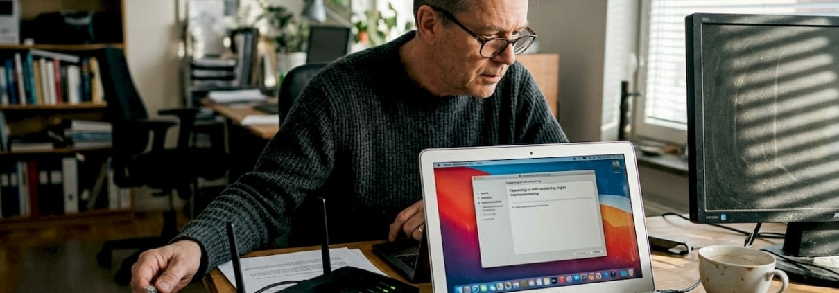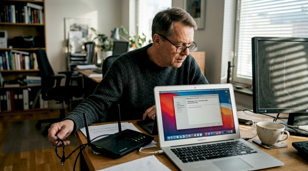 Man felsöker sitt trådlösa nätverk hemma med hjälp av dator och router.